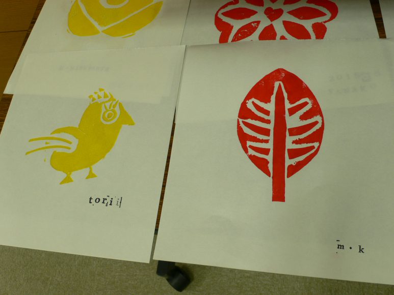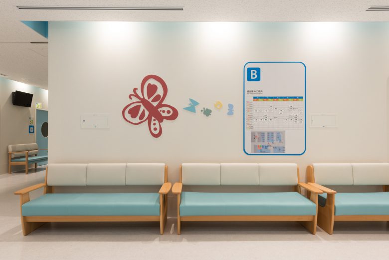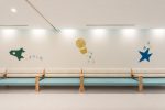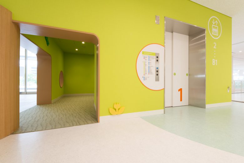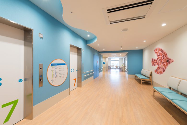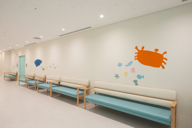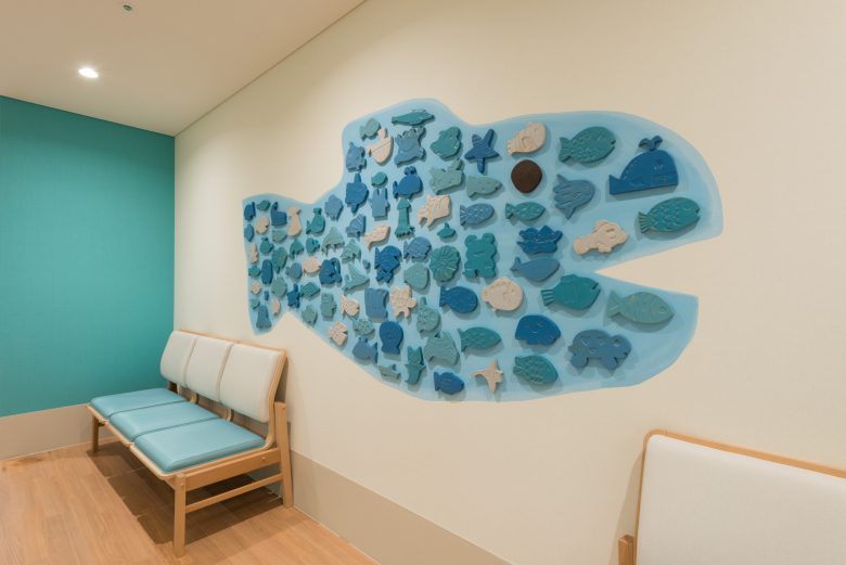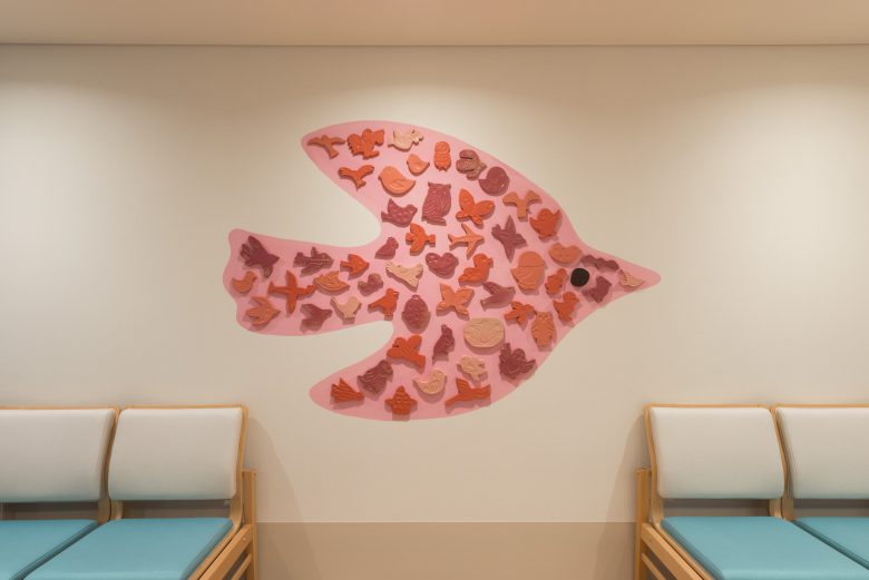 エレベーターホールには病院スタッフの皆様とワークショップでつくったハンコを用いて陶板を制作しました。