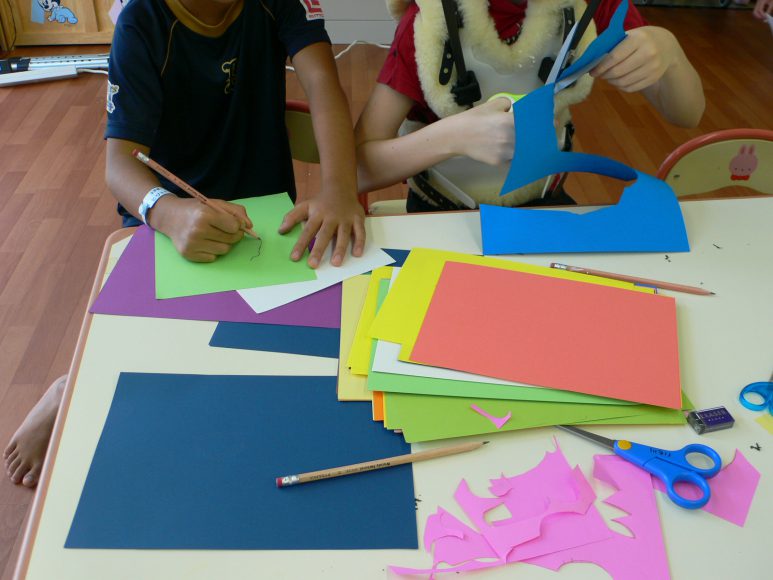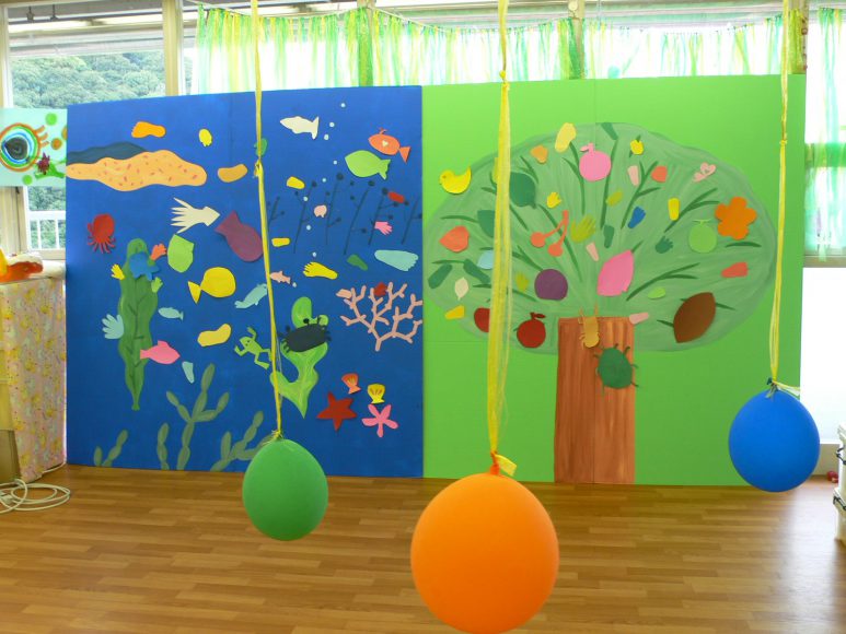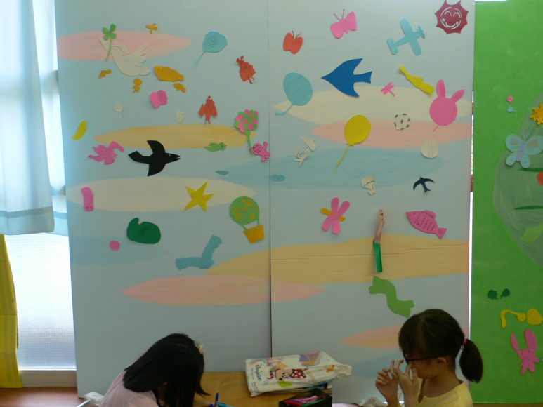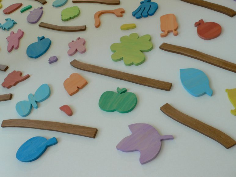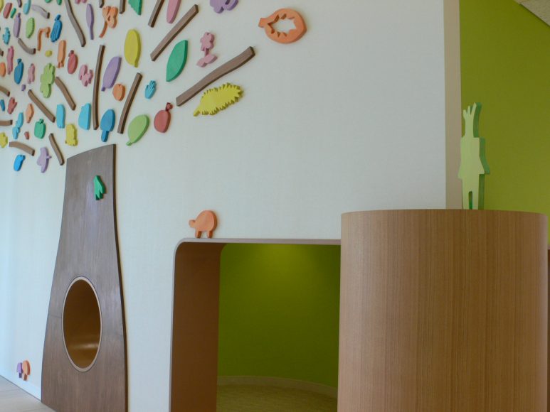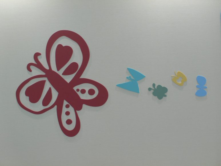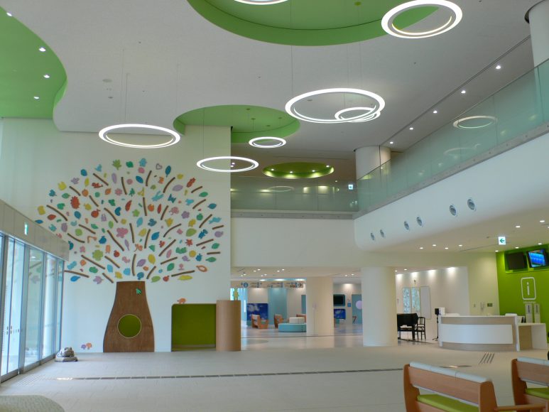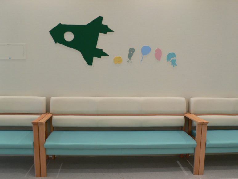 この切り紙を木やアクリルレリーフに置き換えて病院のエントランスホールや廊下に配置しました。