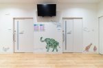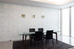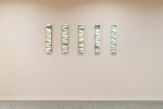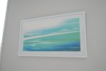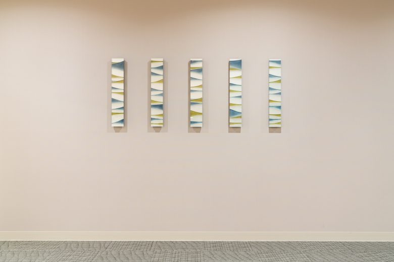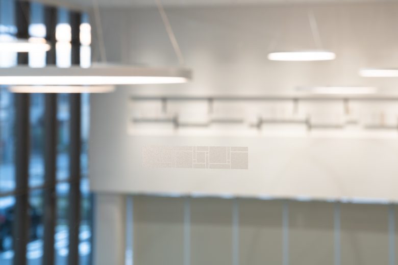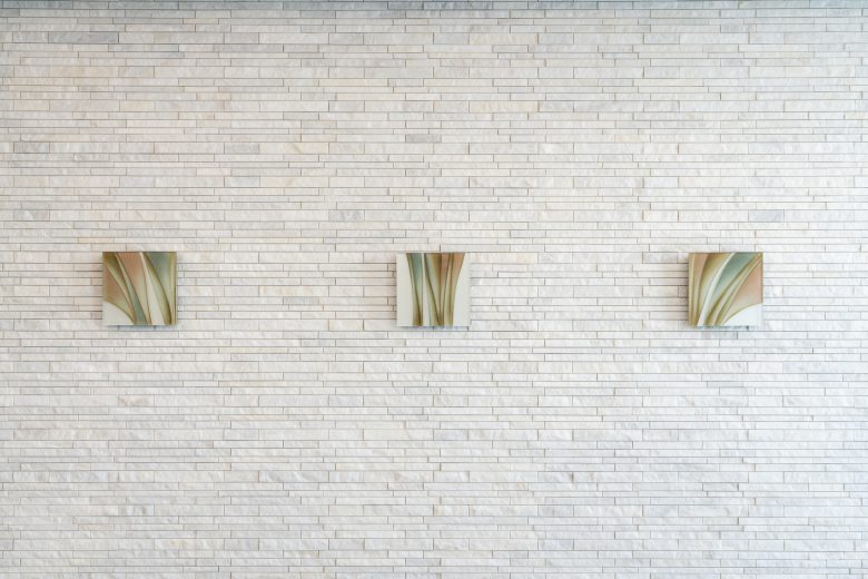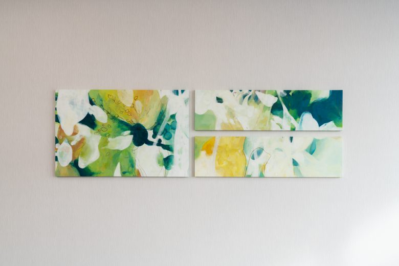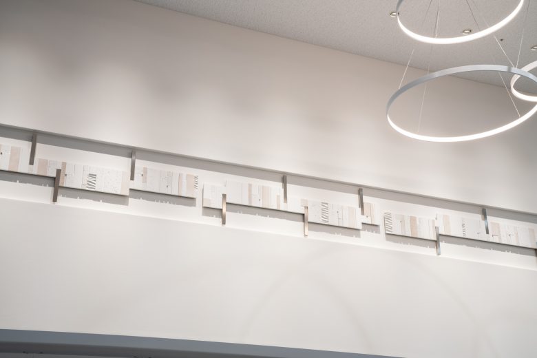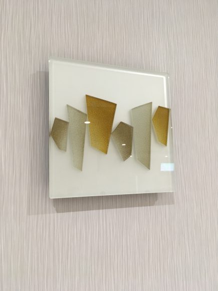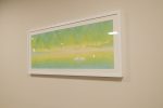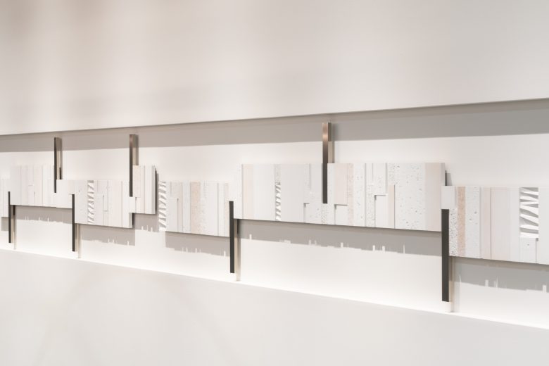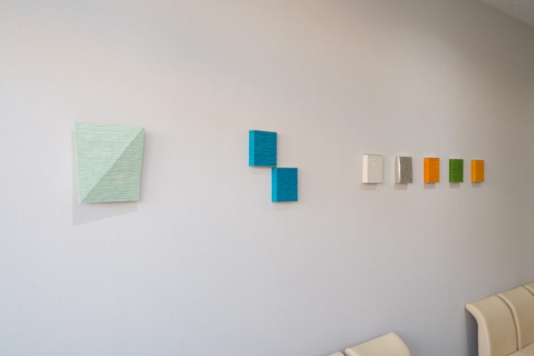 白い壁と一体化したコラージュ、壁面形状に呼応した横長のプロポーション