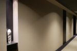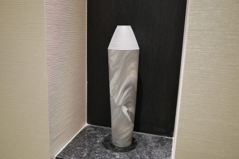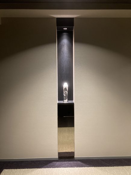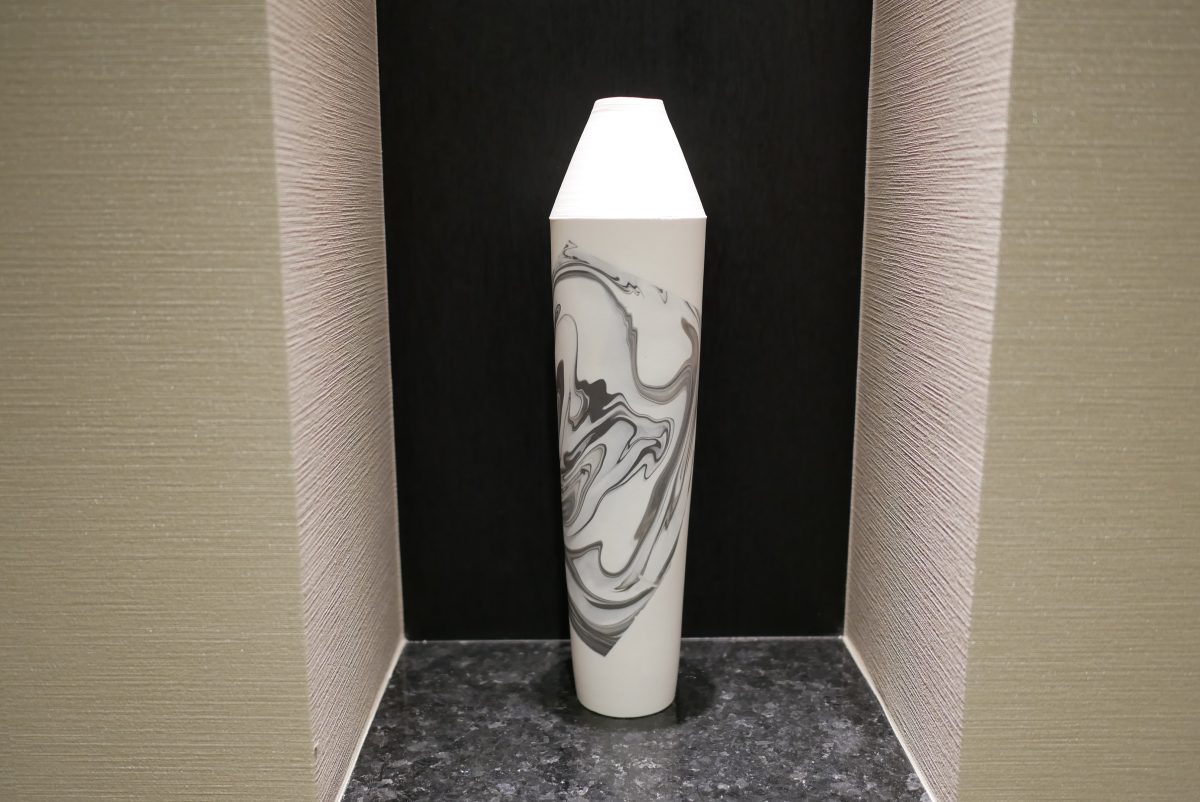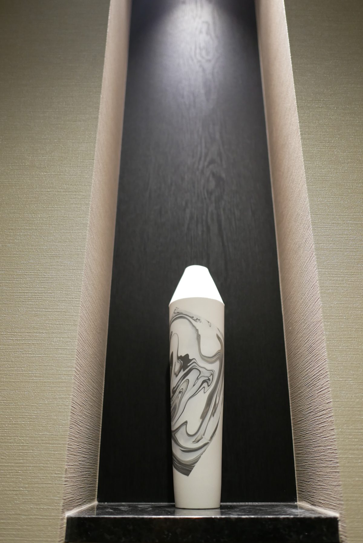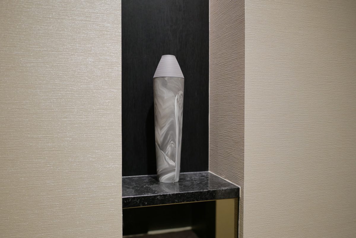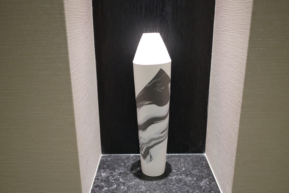 レジデンスの各フロアの飾り棚に、北棟は灰色基調、南棟は白色基調の陶オブジェを配置。