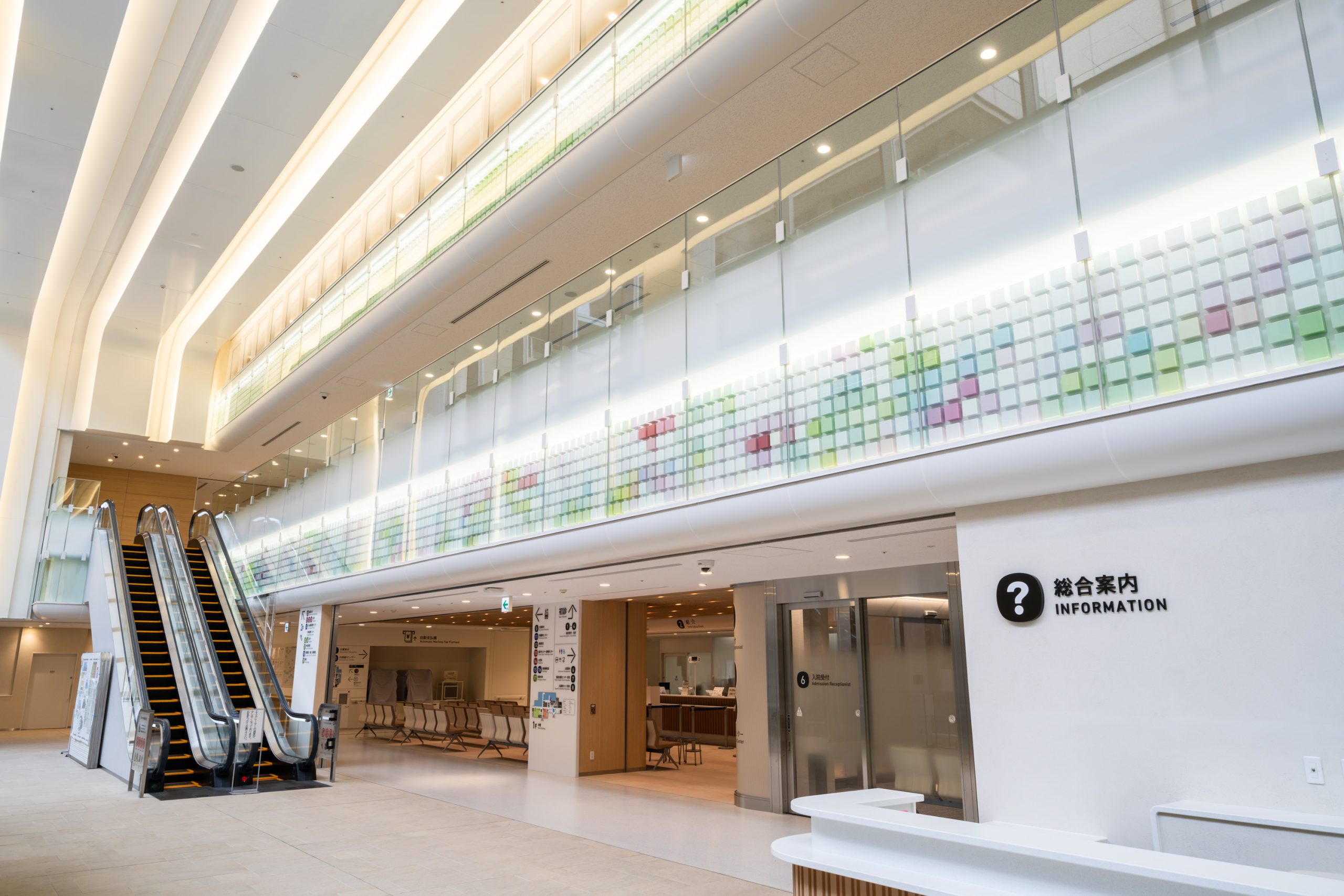 長さ42mのエントランスの壁面に多摩産の木で制作した3817個のキューブを配置しています。