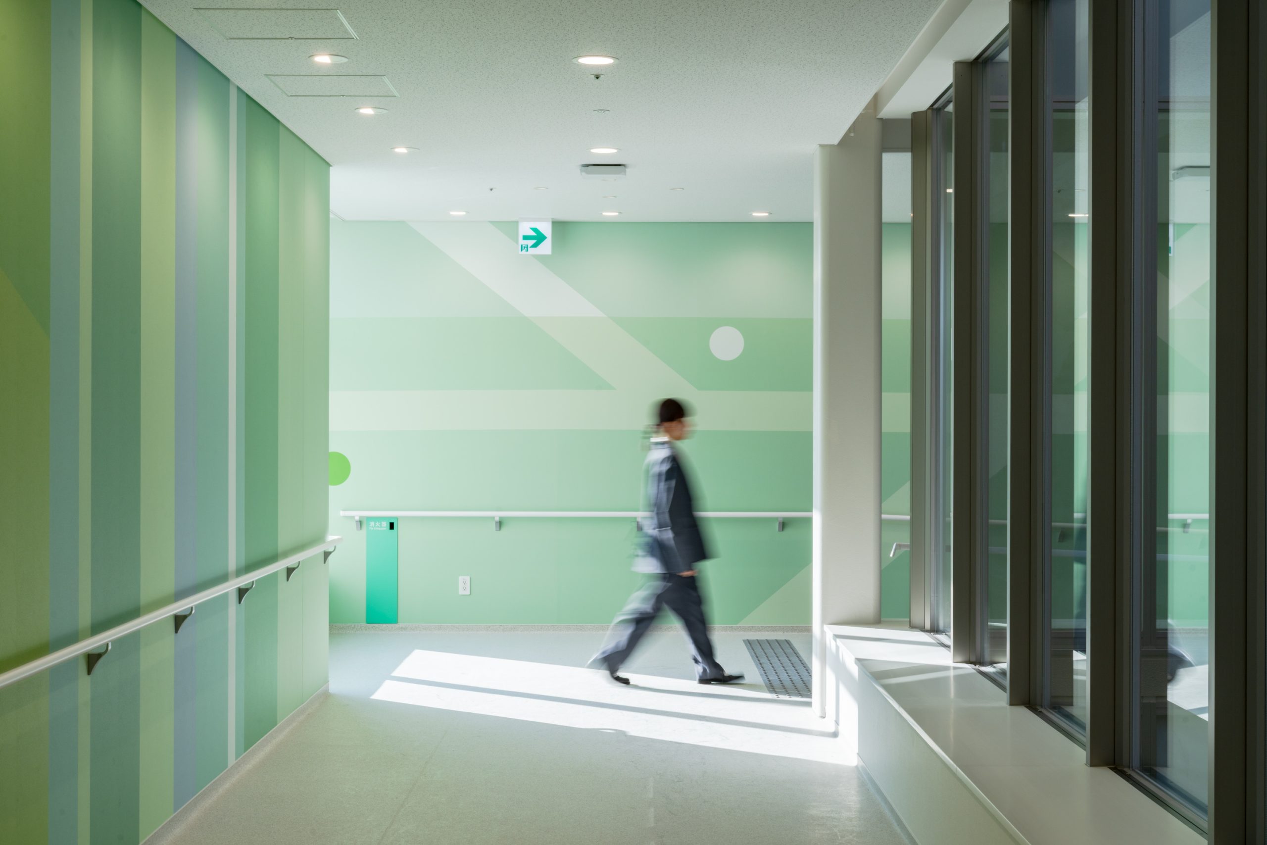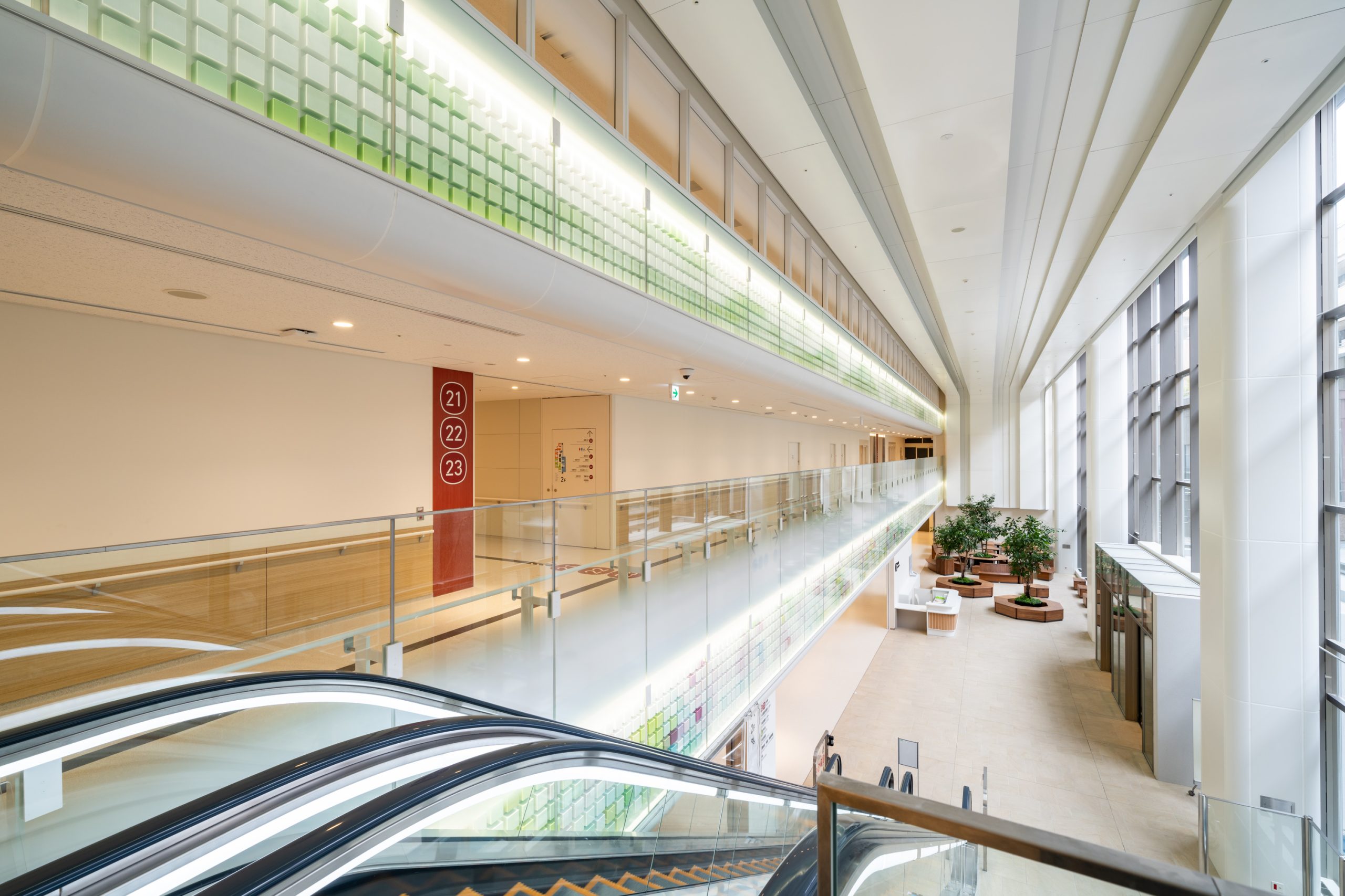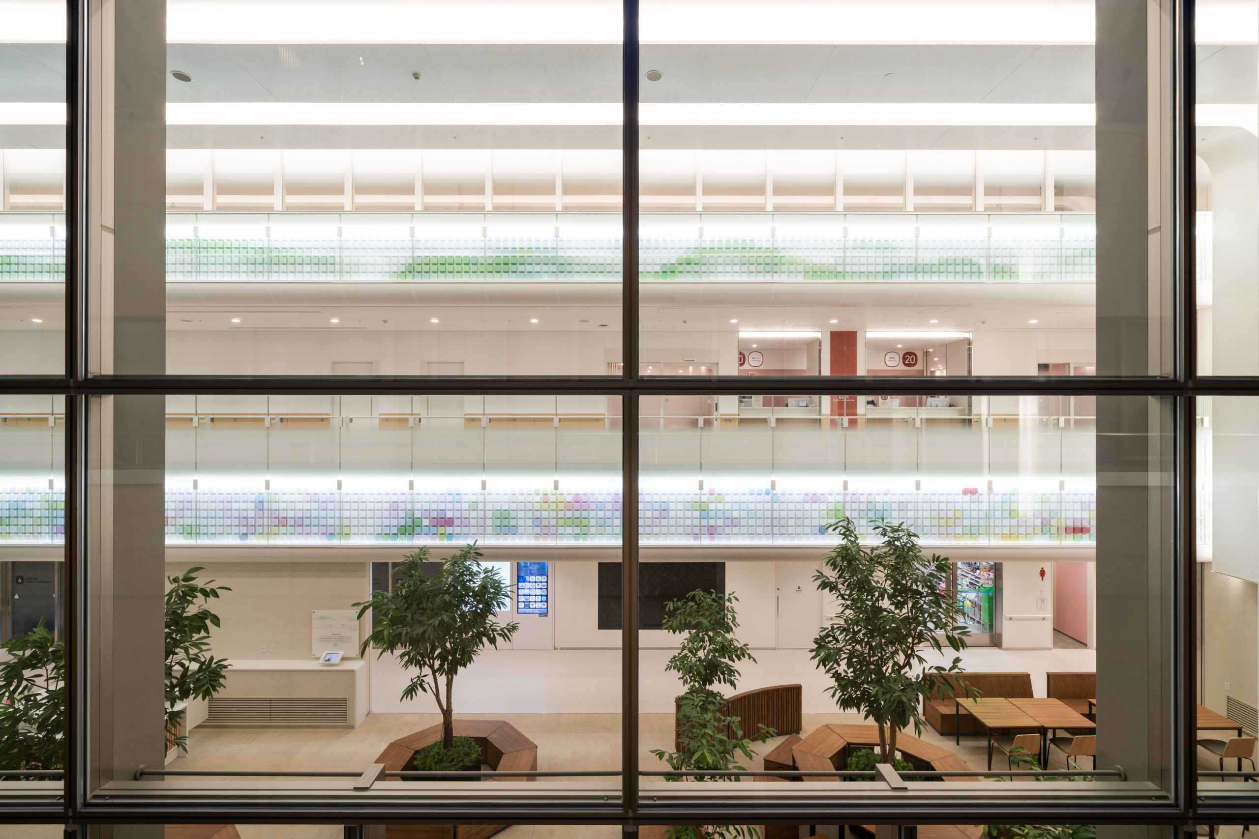 外観からの景観としても重点をおき、柔らかい色の帯が優しい明かりとなり、日暮れや夜間に通る人々にも